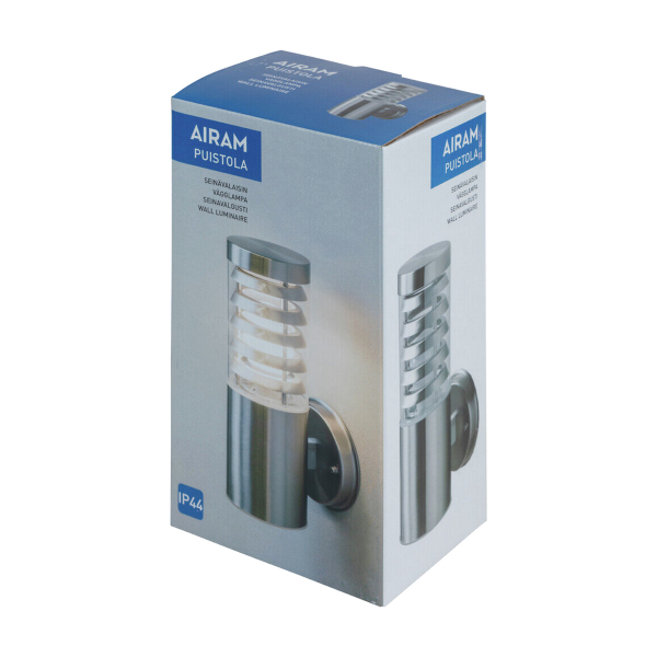 Airam Puistola S on pinta-asennettava seinävalaisin, joka sopii esimerkiksi talon julkisivun tai terassin valaisuun. Valaisin sopii E27-kantaisille polttimoille (ei sis.) ja lamppuvalinnalla voi oleellisesti vaikuttaa valaisimen luomaan tunnelmaan. Teräslamellit kuvun sisällä ehkäisevät häikäisyä ja tuovat eloisuutta pelkistettyyn muotokieleen.