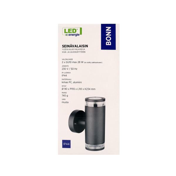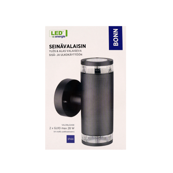 Led Energie Bonn on tyylikäs pinta-asennettava seinävalaisin, joka valaisee suoraan ylös ja alaspäin. Valaisin sopii erinomaisesti esimerkiksi pihapiirin tai terassin valaisuun, ja se toimii kahdella GU10-kantaisella polttimolla (ei sis.). Polttimot voi vaihtaa, minkä ansiosta valaisimeen voi valita itselleen sopivan tehon ja värilämpötilan, jolloin valaisimella saadaan luotua omaan tarpeeseen sopiva tunnelma. IP44-luokitus mahdollistaa valaisimen sijoittamisen mihin tahansa pihapiirissä.