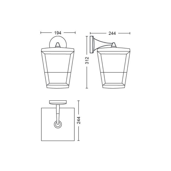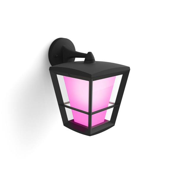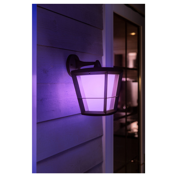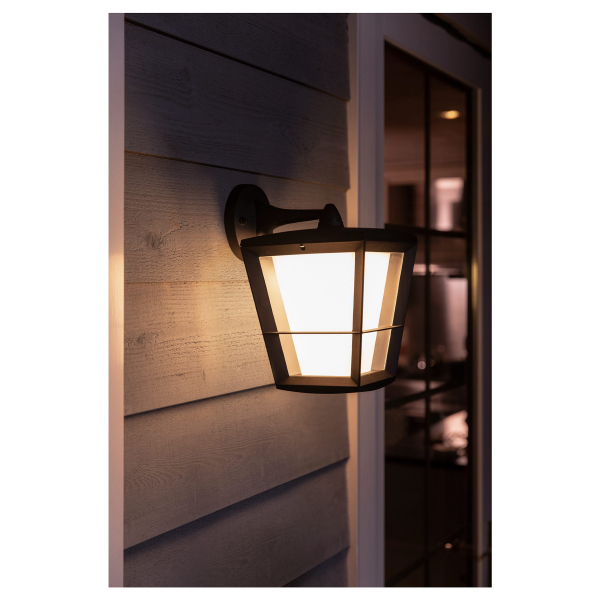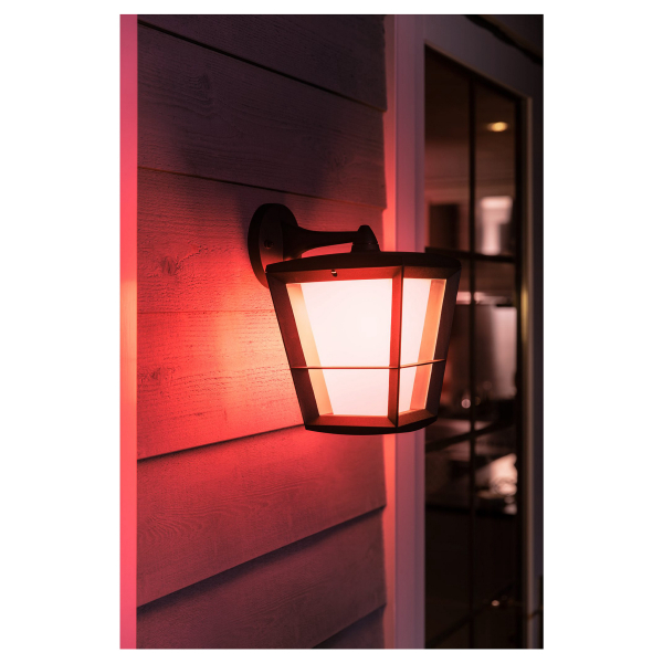 Klassinen ulkotiloihin soveltuva ripustettava Philips Hue-seinävalaisin, jota voidaan ohjata Philips Hue Bridgen välityksellä. Ilmoitettu valoteho 1140 lm, valon väri säädettävissä. Värilämpötila 2000 - 6500 K, IP44-luokitus.