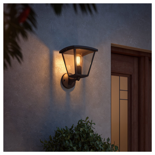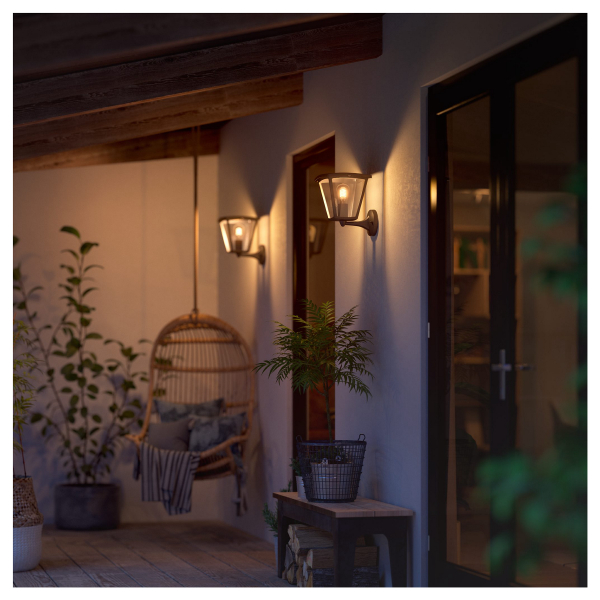 Tyylikäs E27-kantaisella Philips Hue-älypolttimolla varustettu seinävalaisin esim. pation valaisuun. Valaisinta voidaan ohjata Philips Hue Bridgen kautta. Ilmoitettu valoteho 550 lm, värilämpötila 2200 - 4500 K. IP44-luokitus.