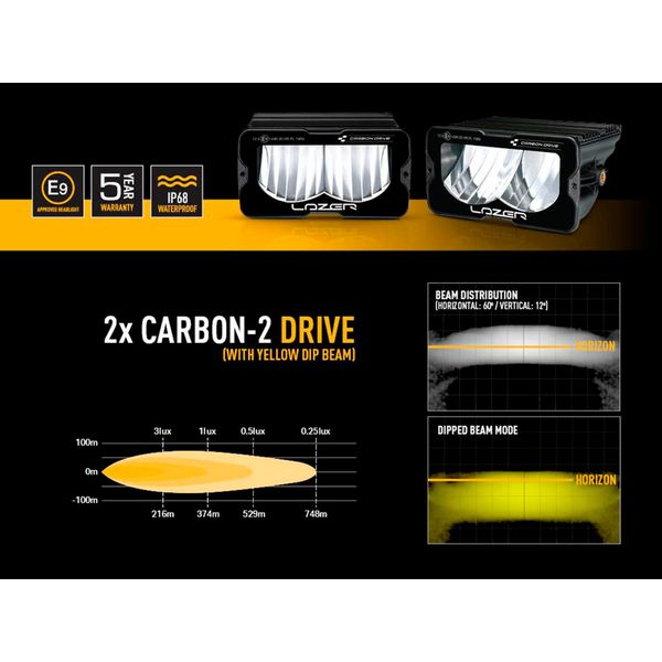Lazer Carbon-2 Drive on pienikokoinen, mutta todella tehokas lisävalo, joka on alunperin suunniteltu vastaamaan ralli- ja rata-autojen sekä muiden moottoriurheiluajoneuvojen korkeisiin vaatimuksiin lisävalon keveydestä, pienestä koosta sekä toiminnallisuudesta. Tästä syystä yksi valaisin on ainoastaan 12 cm leveä ja painaa vaivaiset 192 grammaa, mutta tuottaa silti 3120 lumenin valotehon. Carbon-2 Drive -valosta löytyy kaksi eri käyttötilaa: rajoittamaton Boost-tila (E-hyväksytty) sekä nk. "Dip-tila" (EI E-hyväksytty), jossa valon väri muuttuu keltaiseksi ja valokeila suuntautuu alemmaksi. Tämä ominaisuus on erinomainen esim. huonoissa keliolosuhteissa, sillä keltainen valo läpäisee mm. sumun ja vesi- tai lumisateen kirkasta valoa paremmin. Valkoinen valo on varustettu neutraalilla 5000K värilämpötilalla, joka maksimoi terävyyden ja erottelukyvyn kovissakin nopeuksissa.