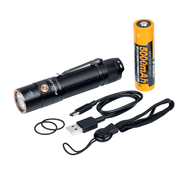Valaisimen mukana toimitetaan: Fenix ARB-L21-5000U Li-ion akku, USB-C -latausjohto, O-rengastiiviste, käyttöohjeet sekä käytännöllinen rannehihna. Lisäksi valaisimen rungossa on valmiina metallinen, irrotettava sivuklipsi, josta valaisimen saa kätevästi kiinnitettyä eri varusteisiin sekä esim. taskun reunaan tai vyölle.