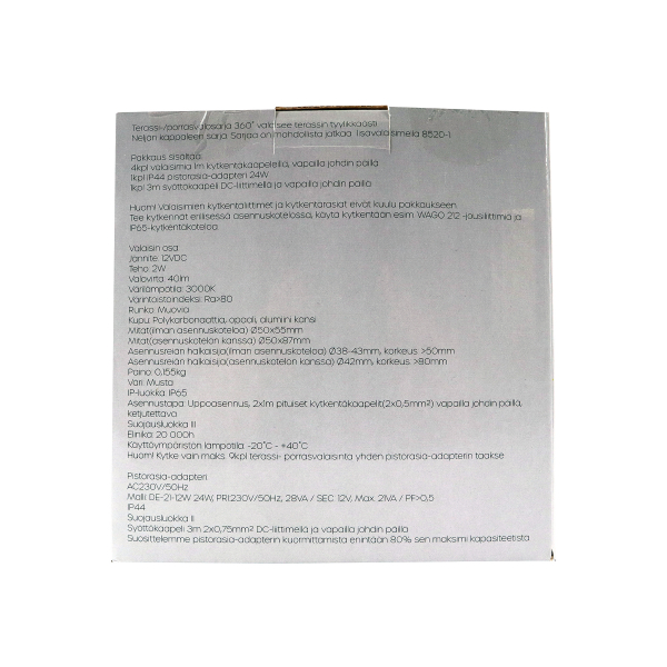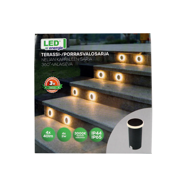 Led Energien tyylikäs uppoasennettava, joka suuntaan valaiseva terassivalosarja, joka sopii esimerkiksi sisäänkäyntien ja portaikkojen valaisuun. Pakkaukseen kuuluu neljä kappaletta 2W valaisinosia 1 m johdoilla sekä muuntaja 3 m johdolla. Valaisimet on ketjutettavissa ja valosarjaa voi halutessaan laajentaa jopa 9-osaiseksi erikseen myytävillä lisälampuilla. Yhden pistorasia-adapterin taakse voi kytkeä vain yhdeksän valoa, valaisimien kytkentäliittimet ja kytkentärasiat eivät kuulu pakkaukseen. Kytkennät voi tehdä erillisessä asennuskotelossa, ja siihen voi käyttää esim. WAGO 212 -jousiliittimiä ja IP65-kytkentäkoteloa. Asennusreiän halkaisija: (ilman asennuskoteloa) 38 - 43mm, asennusreiän halkaisija: (asennuskotelon kanssa) 42mm. Ilmoitettu valoteho 4 x 40 lumenia, värilämpötila 3000 kelviniä.