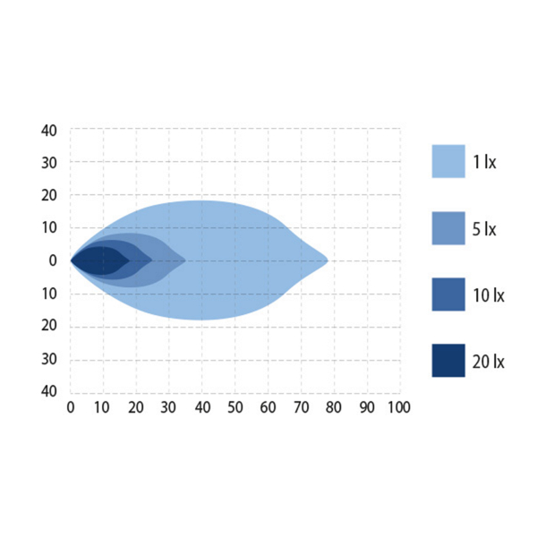• Valmistajan ilmoittama kantama: 80 m @ 1 lux