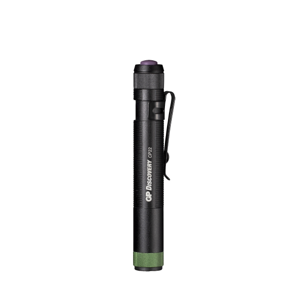 GP Discovery CP22 on 365 nm aallonpituudella varustettu pienikokoinen UV-taskulamppu, joka on ohuen, kynämäisen runkonsa puolesta tarkoitettu kulkemaan aina mukana. Valaisin on suunniteltu mm. sormenjälkien, tahrojen ja öljyvuotojen etsintään, johon 365 nm aallonpituus on optimaalisin. Kestävä alumiininen runko on uritettu pitävän otteen varmistamiseksi. Valaisin on IPX4-luokituksen mukaan roiskevesisuojattu, eli normaalikäytössä valaisimen kestävyydestä ei tarvitse olla huolissaan. Helppokäyttöisessä CP22:ssa ei ole mitään ylimääräisiä toimintoja, ainoastaan yksi tehotila. Paloaikaa valaisin tarjoaa 3.5 tuntia.