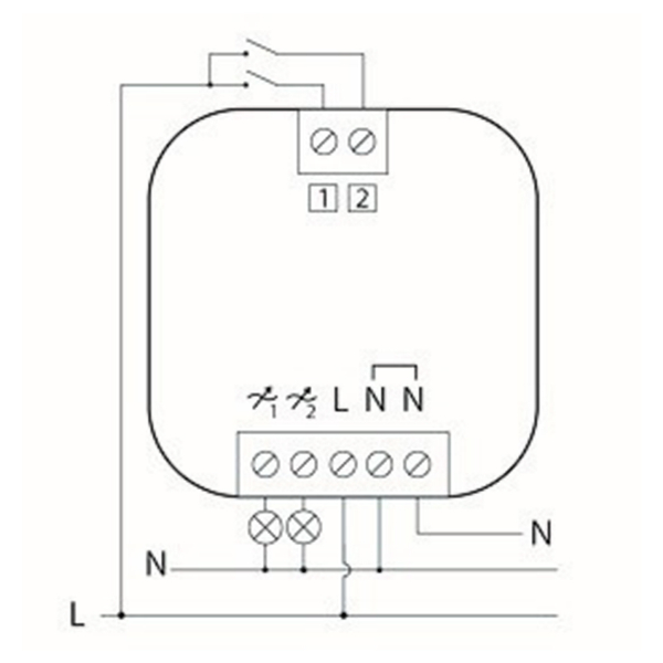 Kaksikanavainen Plejd-valonsäädin 1-2 valaisimen ohjaamiseen. Voidaan asentaa 5-kytkimen taakse. Säätimen avulla valoja voidaan ohjata palauttavalla painikkeella, kytkimellä, liiketunnistimella tai älypuhelimella Bluetoothin ja mobiilisovelluksen avulla. 1 ja 2 kanavilla voidaan käyttää eri kuormia.