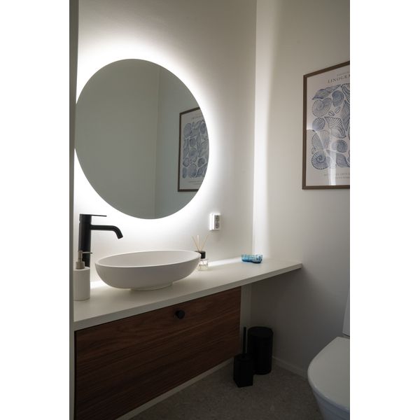 Peilin taustavalosta tuleva valo tuo mukavan lisän esimerkiksi kylpyhuoneen kattospottien rinnalle, ja se toimii myös pehmeämpänä valovaihtoehtona aamu- ja ilta-ajan toimille. Mikäli peiliä käytetään sisustuselementtinä, luo peilivalo kotiin kauniin yksityiskohdan, joka ei jää keneltäkään huomaamatta. Pyöreä muotoilu sekä tasainen valonjakauma saavat peilivalon sopimaan käytännössä minkälaiseen ja kokoiseen tilaan tahansa, ja suuren koon ansiosta se luo myös pienempiin tiloihin mukavaa avaruutta. Peili on IP44-luokituksen mukaisesti roiskevedeltä suojattu, joten se voidaan asentaa kosteisiin tiloihin. Mikäli valaisin asennetaan kylpyhuoneeseen, voidaan siitä asennusvaiheessa kytkeä käyttöön sisäänrakennettu huurteenestotoiminto, joka ehkäisee peilin huurtumista esim. kuuman suihkun tai saunomisen yhteydessä. Kun huurteenesto on kytketty käyttöön, se aktivoituu aina peilivalon ollessa päällä. Kahden vuoden (24 kk) takuu!